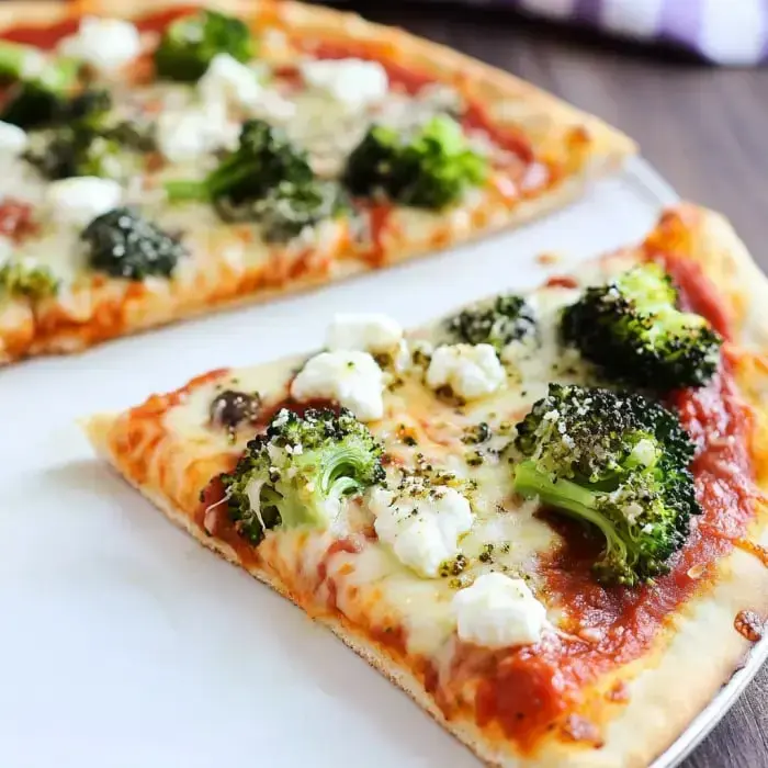This is a flavorful pizza loaded with soft broccoli, a trio of cheeses, and olives over a homemade base.