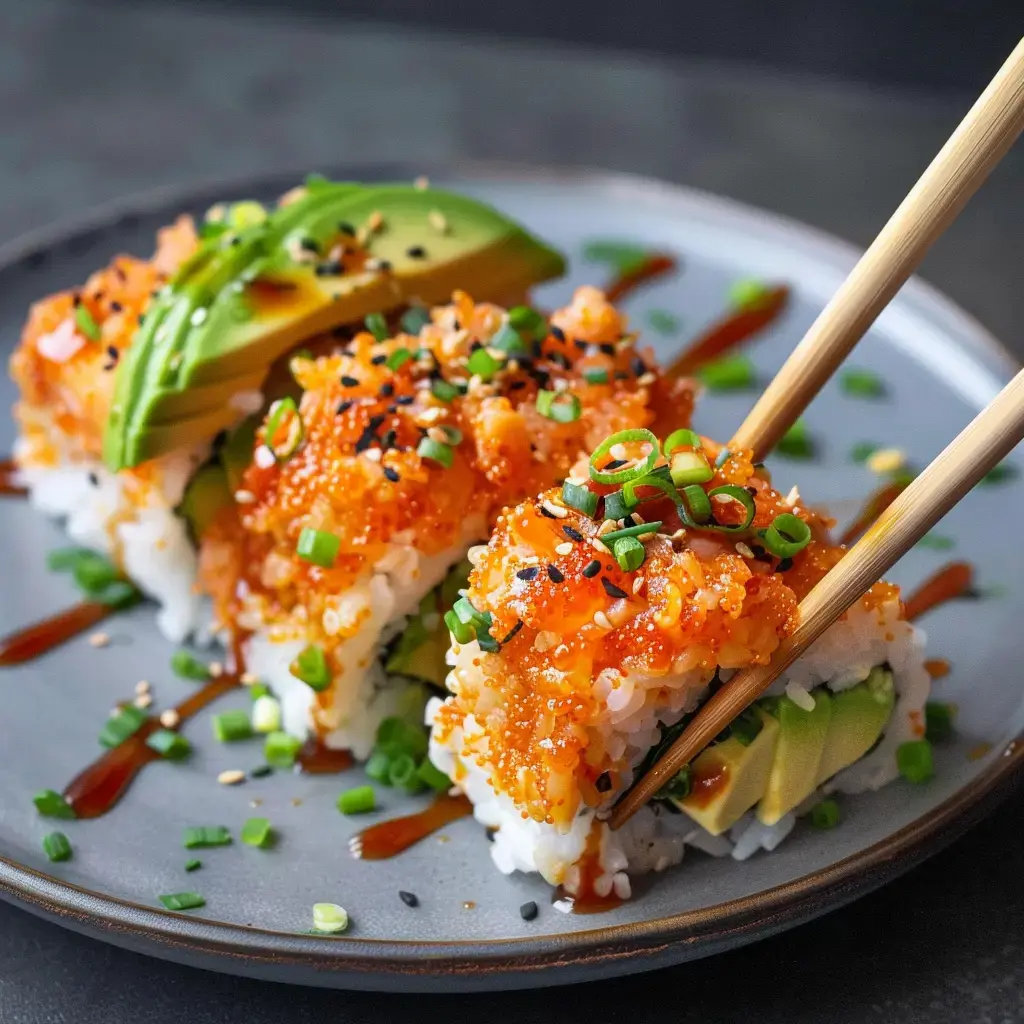 Crispy rice layered with spicy tuna, creamy avocado, and furikake for an easy sushi-style meal.
