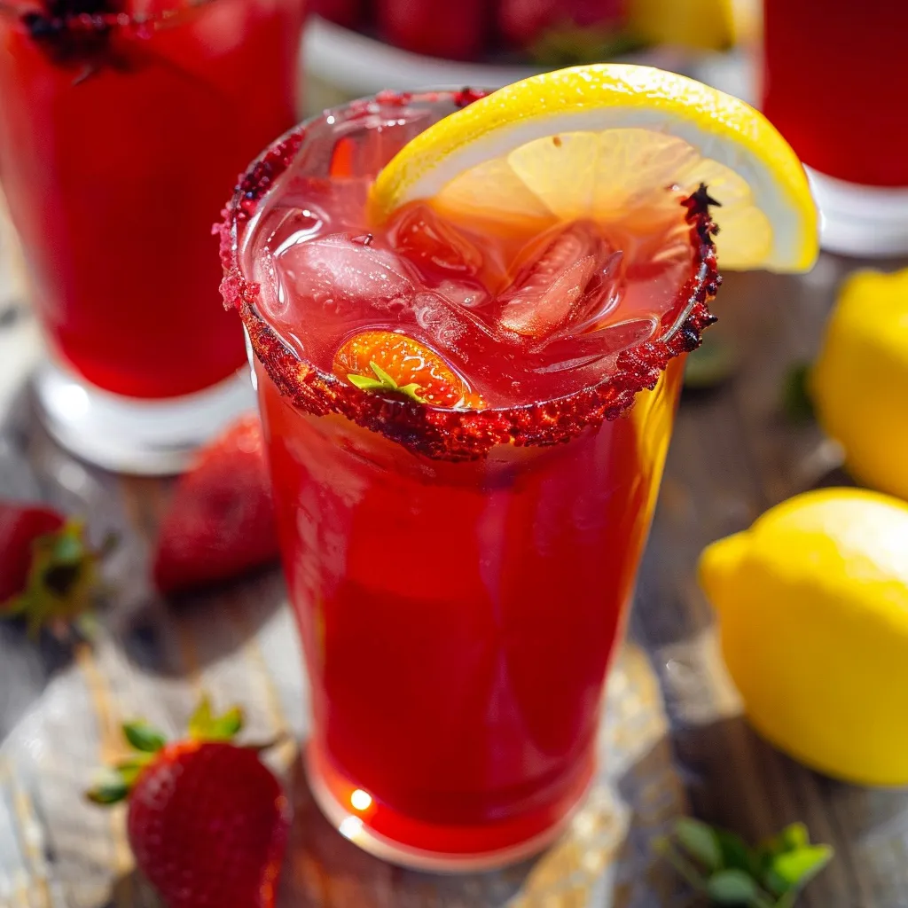 This icy drink blends hibiscus tea, lemon, and strawberries for a perfect way to cool off when it's hot outside. The bold red color and the mix of tart and sweet makes it a great swap for store-bought sodas.
