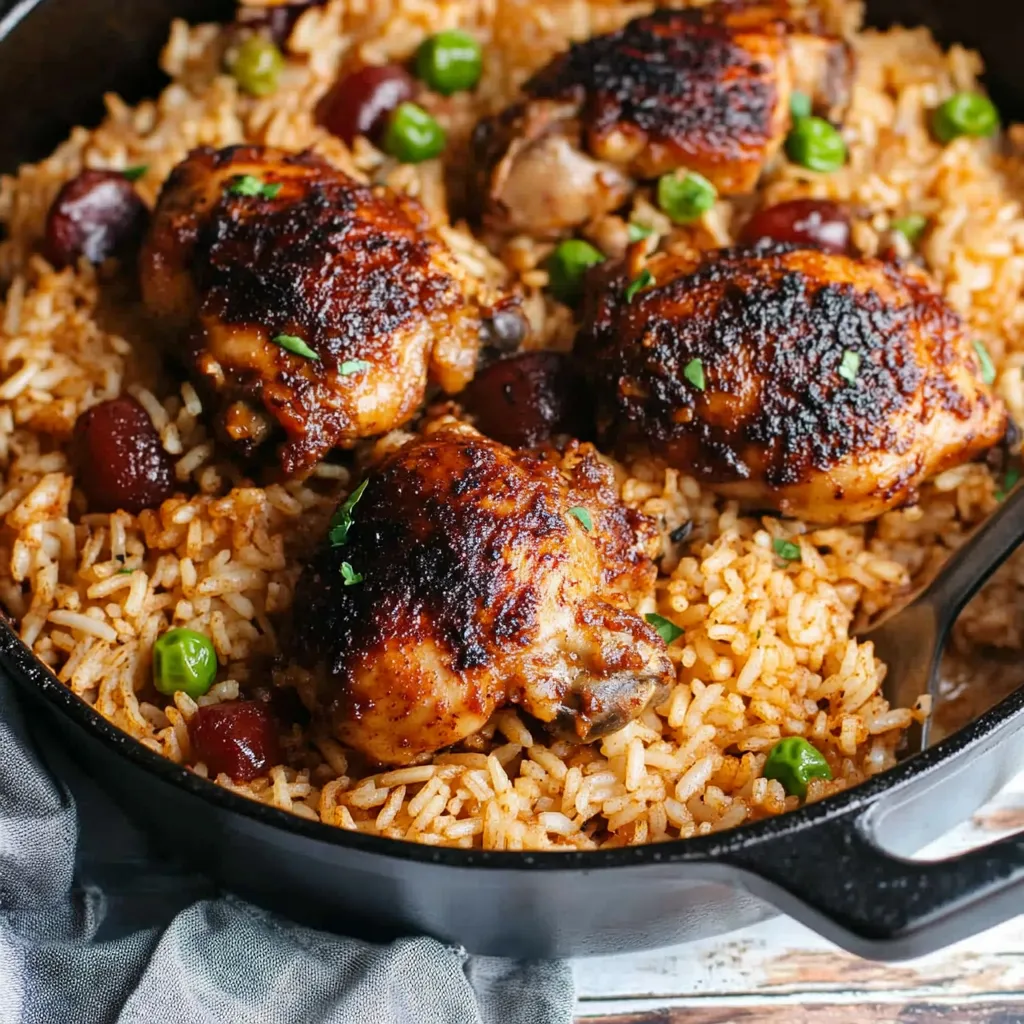 Sink your teeth into this island delight that combines juicy jerk chicken with flavorful coconut rice and beans. As the well-seasoned chicken cooks, its tasty juices drip into the fluffy rice below, making every forkful burst with Caribbean goodness.