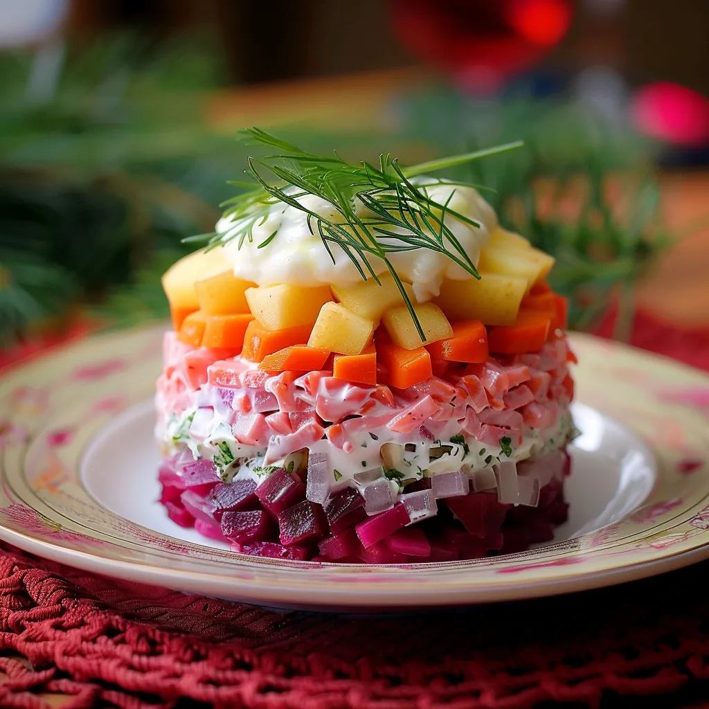 This colorful layered Russian salad makes any get-together feel extra fancy. The way the tangy and earthy flavors work together gives you a tasty balance, so folks will be talking about this dish long after the party.